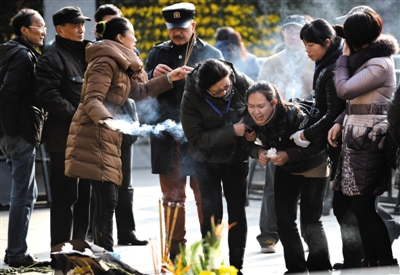 昨日,上海,外滩踩踏事件遇难者家属来到事发地献花祭奠。2014年12月31日夜,上海外滩发生踩踏事件,官方宣布共有36人遇难。图/CFP
