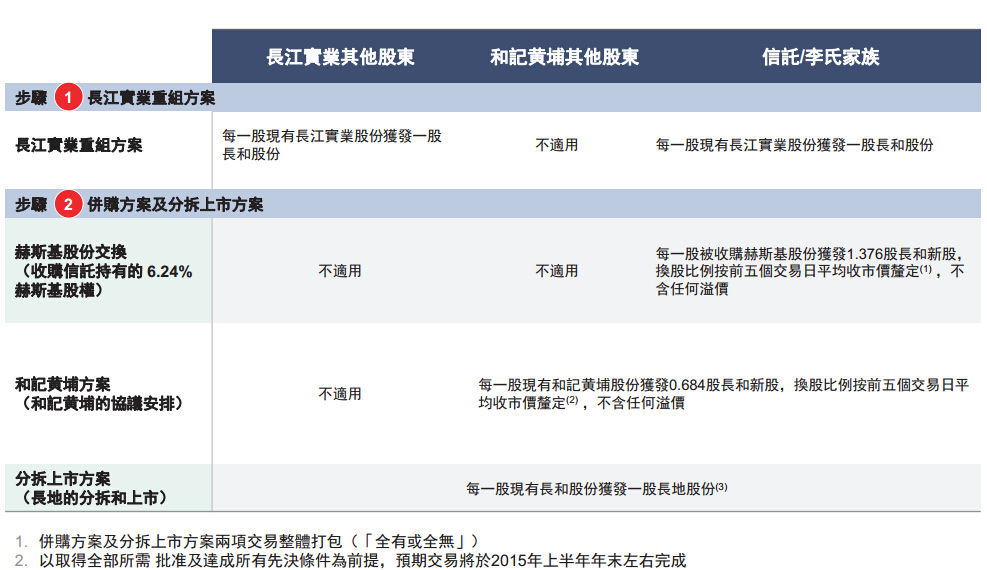 长和系表示,该等方案之目标为,消除长实持有之和黄股份之控股公司折让,从而为股东释放实际价值;提高透明度及业务一致性;消除长实及和黄之间的分层控股架构,让股东能与该信托一同直接投资于两间上市公司;让所有股东直接持有长和及长地的股份,从而提高投资的灵活性和效率;及提升规模。