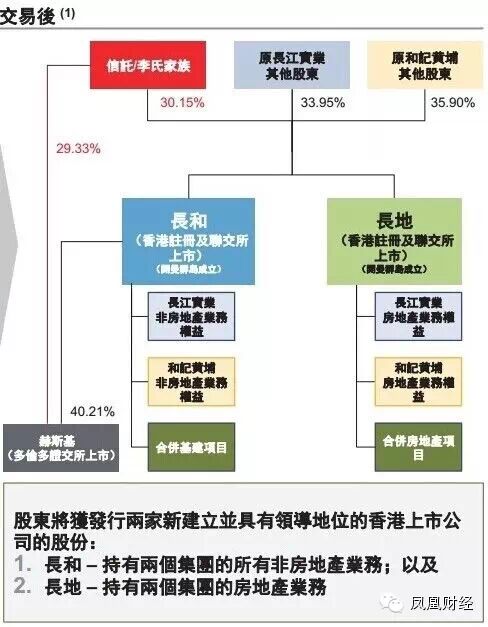 凤凰财经综合 2015年1月9日,李嘉诚旗下长和系公布重大重组计划,长江实业提议集团重组。重组后,长江实业与和记黄埔将变成两个新公司:长和、长地。长和接管两公司非地产业务,而地产业务将由长地负责。长江实业预计重组将在2015年上半年结束前后完成。