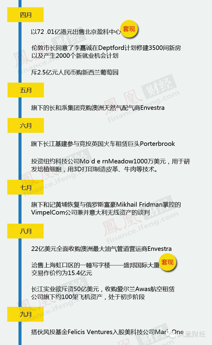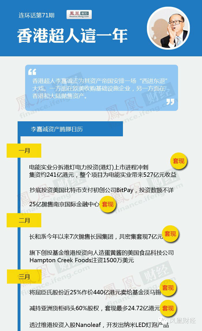 尽管李嘉诚于记者会上否认变相从香港迁册,但李嘉诚于2014年前三季度却进行了多笔套现交易。“没有一个行业会永远兴旺下去。”李嘉诚重组长和系的真正原因,恐怕也只有他自己知道了。