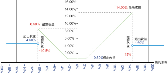 收益计算:与固定收益类产品不同,结构性产品的收益率并非以“预期收益率”的形式体现,取而代之的是“收益率区间”,而最终的到期收益率则由收益结构和挂钩标的走势决定。