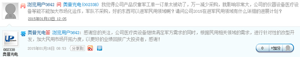 奥普光电(002338) 16日在深交所互动易平台表示,公司医疗类设备继续满足军方需求的同时,根据民用相关领域的需求,进行针对性的改型开发,加大民用市场开拓力度。