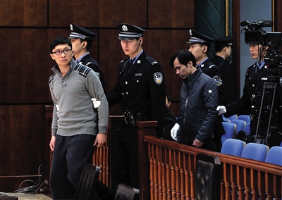 昨日,因有偿删帖涉嫌非法经营罪,被告人杨飞(左一)、李金福(左二)被带上法庭受审。新京报记者 王贵彬 摄