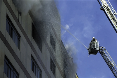 昨日,消防员正用水枪向着火楼层喷水。前日上午9时许,百荣商城二期小商品城7层仓库起火。新京报记者 周岗峰 摄