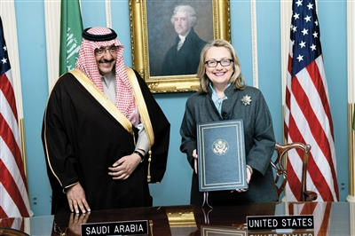2013年,华盛顿,时任美国国务卿希拉里与纳耶夫。