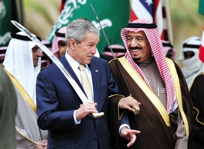 2008年,萨勒曼与时任美国总统小布什观看沙特传统剑舞。