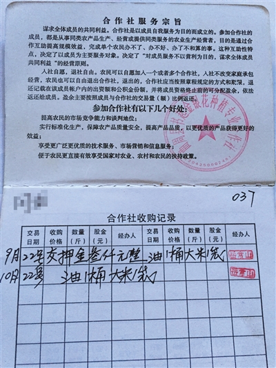 村民们解释,他们把“社员证”当做活期存折,“一千、两千的小钱会存在社员证上,没有利息,存一个月,岳常山就发米、面、油给大家,只要不取,每月都发。”至于该专业合作社,村民们称“不知道是做什么的。”