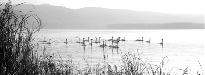 在河南省三门峡市天鹅湖国家城市湿地公园广阔明澈、碧波荡漾的湖面上,成千上万只白天鹅自由自在地飞翔、嬉水、觅食,安详地休养生息。 卢 萍摄