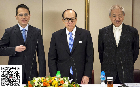 李嘉诚,其子李泽钜(左),及和黄高管Canning Fok在香港一起出席记者发布会。(来源:路透社) 李嘉诚在大量购进欧洲资产后,最近开始抛售和黄所持有的部分港口股权,而抛售对象是油四家中资国有企业组成的内地财团。