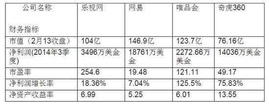 选取与乐视网市值相近的三家互联网公司进行分析,即网易和唯品会,以及刚被乐视超越不久的360,采用2月14日的外汇牌价6.2399进行换算,其主要财务指标如下表所示: