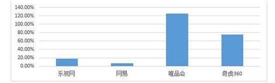 净利润基数仅仅是公司价值评估的一个方面,企业价值很大程度上取决于其持续增长和盈利的能力。网易作为老牌门户网站,游戏早已成为其主要业务,占其总营收的90%以上。由于其本身净利润基数较大,并且游戏行业(主要指端游)出现下滑,保持7%的增长率实属不易。唯品会已多季度持续实现翻倍增长,因此市场给予其百亿美金的估值。然而乐视网相对于唯品会和360来说,其增长率远远低于后两者。四大网站的净利润增长率如下图所示: