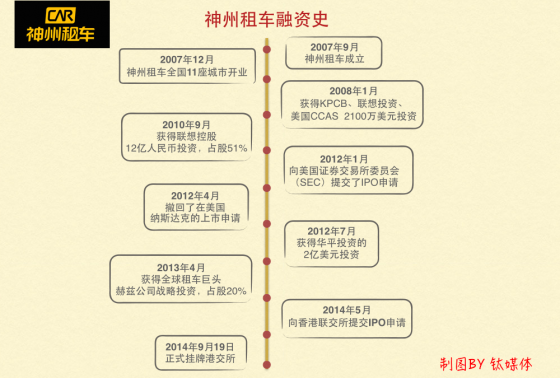 神州租车成立于2007年,是一家汽车租赁服务提供商,其业务线目前包括租车、二手车和专车。在2010年9月15日,联想控股以“股权+债权”形式,向神州租车注资合计12亿元,持股超过51%。在经历了颇为曲折的发展之后,神州租车在2013年开始盈利,2014年9月又再次冲击IPO,终于在港交所上市,成为国内汽车租赁行业的首个上市公司。下图为钛媒体整理的神州租车融资史。
