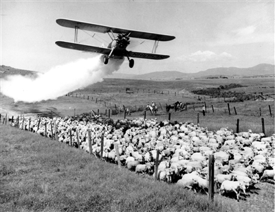 1948年,美国,一架飞机在向羊群和草地喷洒DDT。