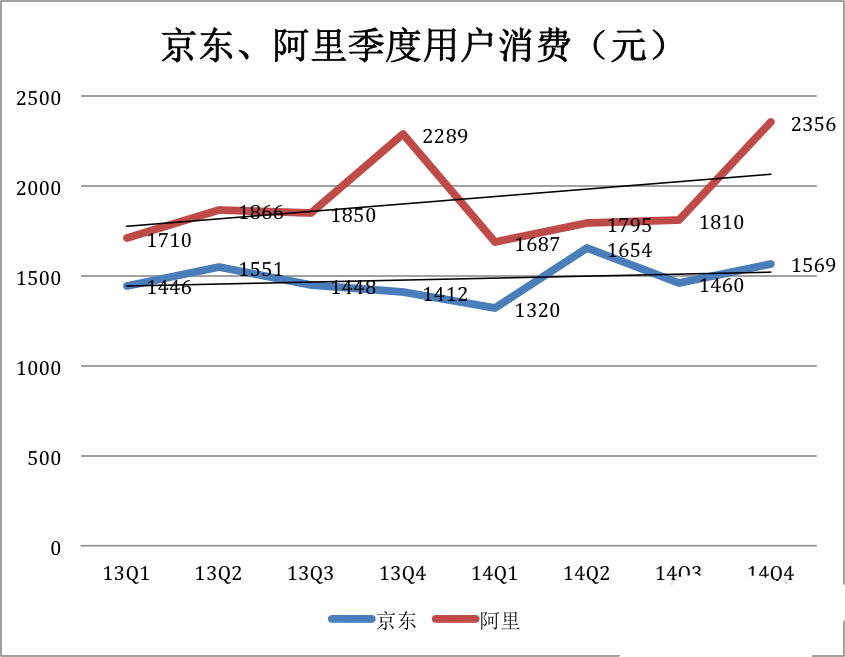 但京东活跃用户季度消费金额却明显低于阿里,2014年Q4的差距达50%(阿里的这个数字为2356元、京东1569元)。