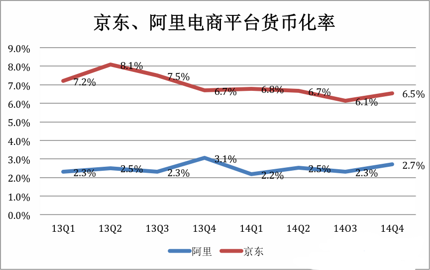 2014年Q4,京东开放平台交易额374亿,带来营收24.5亿,由此可以算出京东开放平台的货币化率为6.5%。同期,阿里电商平台的货币化率仅为2.7%。