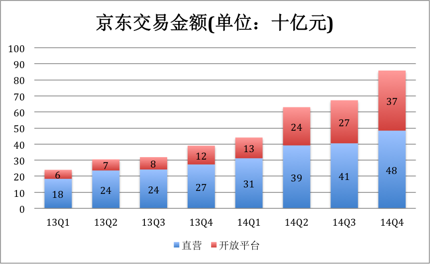 在2014年Q4的858亿GMV中,开放平台的贡献达370亿。开放平台在产品质量、送货体验不及直销(体验过京东开放平台购物却感觉不甚良好的同学请举手),要维持保持良好口碑就要牺牲GMV增速。而且,就冲京东自称“中国最大的自营式电商企业”,开放平台交易额也不应超过四成。