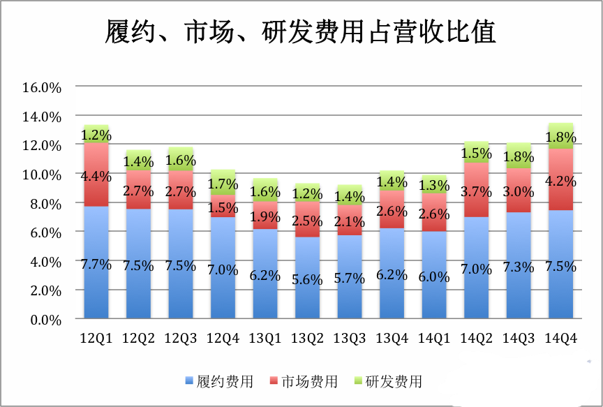 观察京东履约、市场、研发三项费用占营收的比例,2014年Q2开始物流费用占比就超过7%(笔者一直怀疑这不是巧合,而是刘强东对自营心态的写照——把送货成本赚出来就得)。