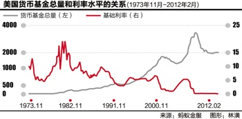 他推断的依据是:美国上世纪70-80年代利率市场化时期,到1974年末,货币基金总量为2.6亿美元,占美国存款机构总存款量不到1%,到1999年末货币基金已与银行存款分庭抗礼。到2001年,货币基金总额为2.14万亿美元,与存款机构存款总额的比率最高达到77%。之后起起落落到2014年1月回落到28%。