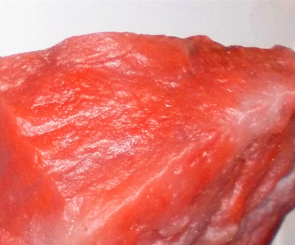 白似羊脂。白色象征着纯洁、高尚和神圣。桂林鸡血玉之白,要雪白、光亮、温润、细密、观似“截脂”,就是刚刚剖开的羊脂。图二、图五、图六,玉底白色胜雪,充分体现着桂林鸡血玉白色部分的冰之清、玉之洁的“凝白”特点。