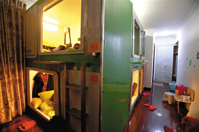 花花(化名)是一名大四学生,今年23岁,学校在天津,来北京找工作。“住快捷酒店一晚上最少200元,住在青年旅舍虽然便宜了,可人杂,环境不好。”花花说,胶囊公寓开在社区里,虽说是一个旅店,但感觉有点像大学宿舍。“刚开始来我觉得有点压抑,‘胶囊’很小,视野不开阔,有的时候感觉屋子空气不流通,喘不上来气,不过时间长了,也就好多了。”