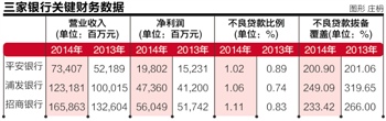 继平安银行2014年年报公布30%的净利润增速后,18日晚间,招商银行、浦发银行亦发布年报:浦发去年净利润473.60亿元,同比增长14.95%;招行去年净利润560.49亿元,同比增长8.32%。