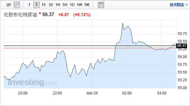 与此同时,ICE布伦特5月原油期货价格收盘上涨1.37美元,涨幅2.49%,报56.48美元/桶,尾盘时段刷新日高至57.17美元/桶,但随后又将涨幅收窄至1.35美元(2.41%)左右。