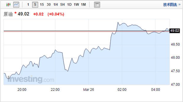 美国NYMEX 5月原油期货价格周三(3月25日)收盘上涨1.70美元,涨幅3.58%,报49.21美元/桶尾盘时段刷新日高至49.46美元/桶、创3月13日以来盘中新高,因为在美元走软为原油市场提供支撑的同时,也门局势动荡加重了投资者对于中东地区原油供应的担忧情绪,进而导致美国原油库存继续增加这一事实被忽略。