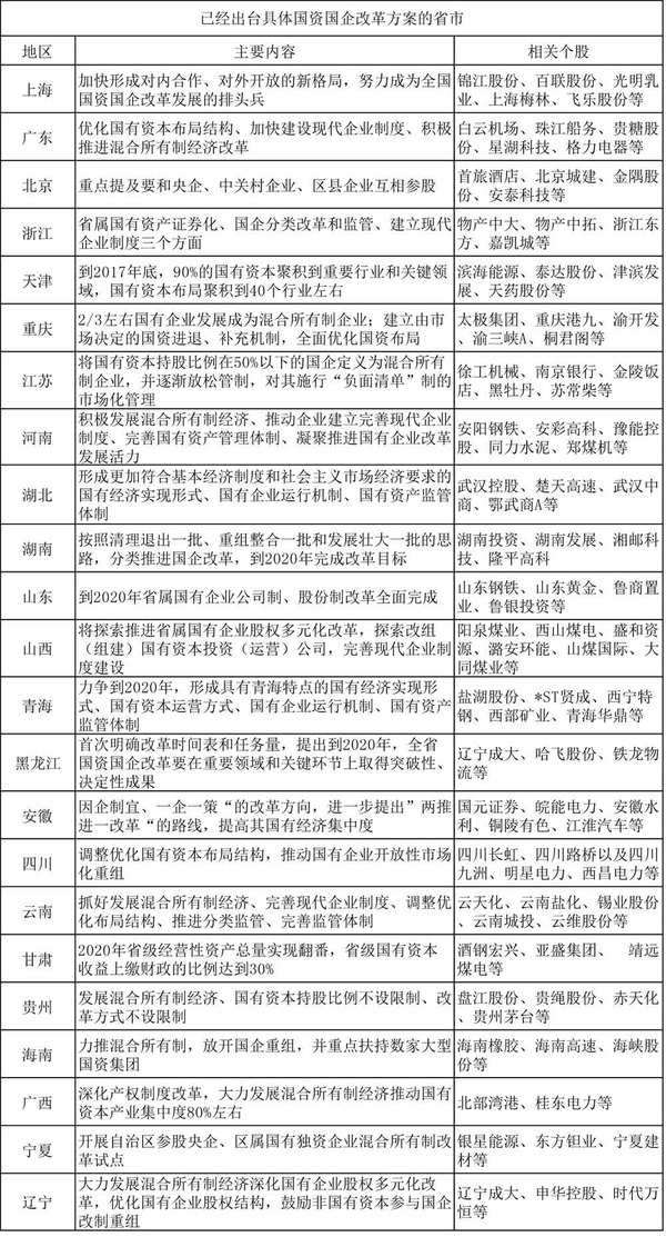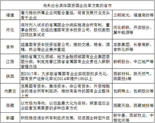 每一次地方国企改革方案的出台,都会引起资本市场对相关概念股的注意。据统计,尚有8省未出台改革方案,证券时报网记者通过查阅各省份2015年政府工作报告及相关资料,整理了以下文件以供参考。