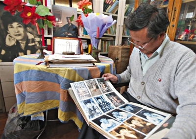 3月28日,北京民俗学家高巍在家中翻看常人春的照片,身旁摆放着常人春的遗照。新京报记者 王贵彬 摄