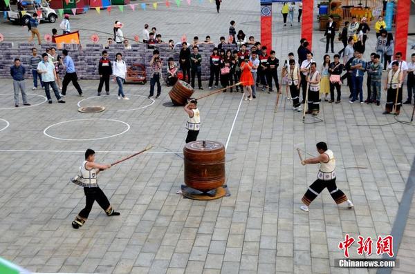 4月2日,长沙世界之窗举行打陀螺挑战赛。一个重达2612斤的大陀螺吸引了众人眼球。该陀螺高115厘米、直径95厘米,重达2612斤,2014年8月制作完毕,总造价达13万元,20位打陀螺高手轮流上阵鞭打。黄维 摄