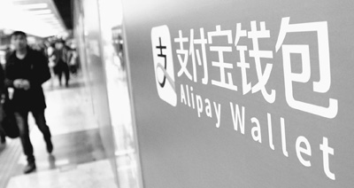 2月24日,南京市民经过支付宝钱包互联网金融业务宣传墙。