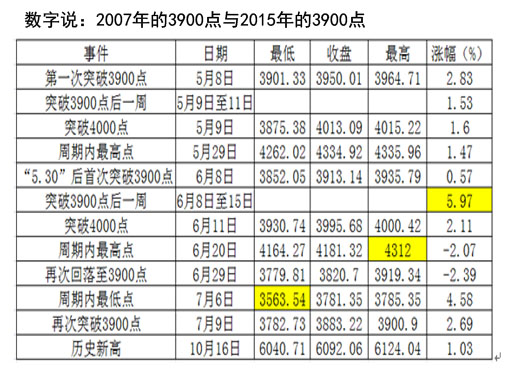 历史不会简单的重复,但会惊人相似。证券时报记者梳理发现,上证指数上一次在4000点关口前,曾几度徘徊。在到达3900点的阶段性关口后震荡整理, 2007年5月8日首次达到3900点,次交易日大盘便冲破4000点,一周后大盘上涨1.53%,期间,上证指数最高涨至4335.96点,随后,在“5.30”事件影响下,大盘回调至3404.15点。