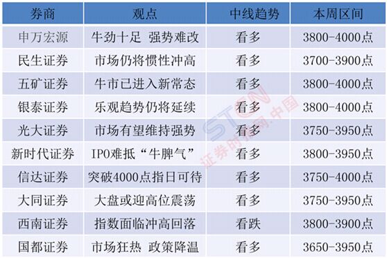 小编梳理了本周部分券商的观点发现,大部分券商看好A股中线趋势, 如银泰证券指出,增量资金入场的趋势并未出现逆转的迹象,无论是以券商融资业务为代表的“杠杆”资金,还是新增股票账户数代表的场外资金,均有进一步提升空间。同时国内稳增长背景下货币政策放松、沪港通和深港通等,也将为股市提供资金来源,利于沪深两市进一步走高。华泰证券甚至在最新发表的研报指出,大牛市刚开始 ,30万亿资金将分三波进A股,沪指将上万点。