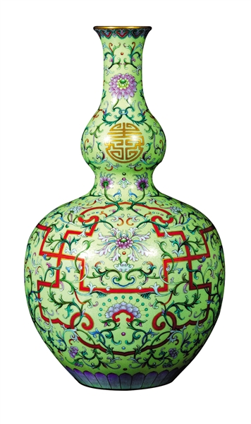清乾隆浅黄地洋彩锦上添花“万寿连延”图长颈葫芦瓶 2010年10月