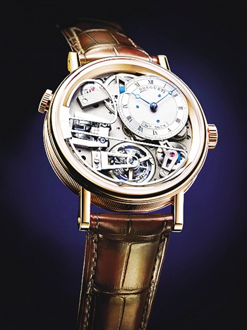 在腕表机械美学方面,宝玑推出的传世系列陀飞轮三问报时表值得一提。今年这款基于宝玑Tradition 7087的Tradition Répétition Minutes Tourbillon腕表可谓融汇了诸多三问报时研究成果,富有机械美学创新性:不同于普通三问报时装置,此款腕表搭载的音锤沿从机芯到表圈的方向作垂直运动,这使机械振动有效地转化为声波;音锤还具有独家专利半主动式减震器,可保持最大敲击力,并消除二次敲击风险;此款腕表底盖内侧设有一片宝玑特别开发的金膜,以提升音量及过滤声音;此外,腕表采用宝玑专利磁性调节器,与三问报时装置完美搭配。它的另外一些个性还包括采用了一款环形自动陀、搭载有宝玑高能发条盒以及硅质游丝等。