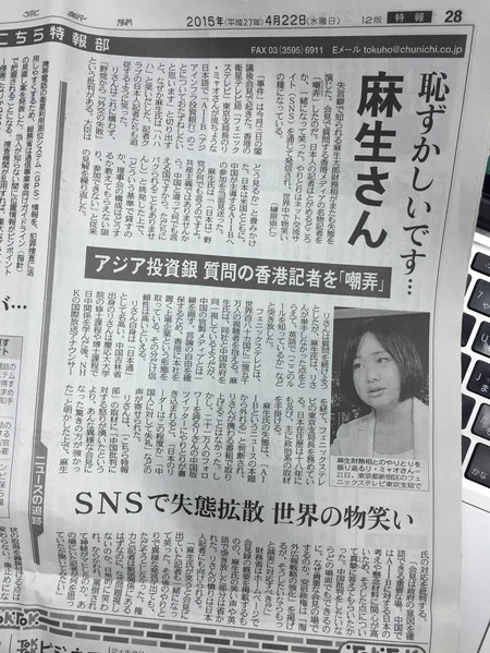 图片说明:4月22日《东京新闻》的特别报道。标题:“麻生,你不羞愧吗?”嘲弄香港记者,失态扩散到全世界,成为全球的笑柄
