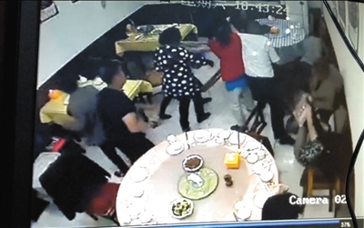 餐馆监控录像显示当时两桌客人的冲突。4月18日晚,因抽烟问题,饭店两桌客人发生打斗。新京报记者 侯润芳 摄