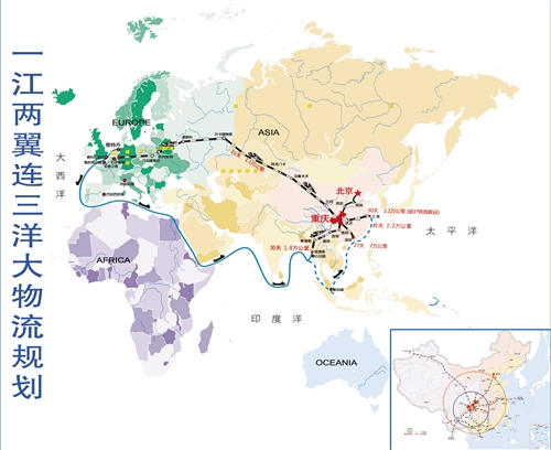 所谓的“一江两翼三洋”国际大通道即是:通过长江连接太平洋;沿渝兰铁路,由新疆阿拉山口出境、经哈萨克斯坦——俄罗斯——白俄罗斯——波兰——德国——鹿特丹港连接大西洋;沿渝黔铁路,由贵阳——昆明——大理——瑞丽出境,经缅甸中部城市曼德勒——实兑港连接印度洋。