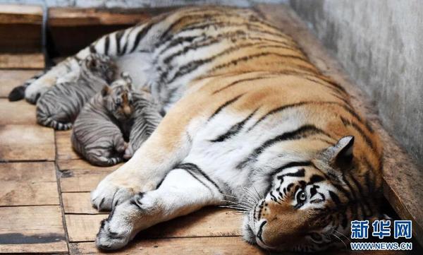 5月6日,几只东北虎“萌娃”依偎在母虎身旁。从4月开始,东北虎人工饲养繁育基地——黑龙江东北虎林园逐步进入东北虎繁育高峰,目前已诞下今年首批20余只东北虎“萌娃”。新生的小东北虎状态良好,最大的已经满月。黑龙江东北虎林园于1986年建立,从建立之初的8只种虎繁育至今,园内的活体东北虎已达千余只。新华社记者王建威摄