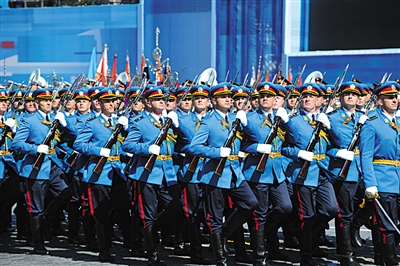 7日,在俄罗斯首都莫斯科,塞尔维亚武装力量仪仗队在彩排中列队前进。新华社记者 戴天放 摄