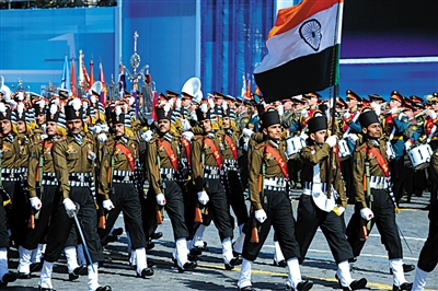 7日,在俄罗斯首都莫斯科,印度陆军掷弹兵在彩排中列队前进。新华社记者 戴天放 摄