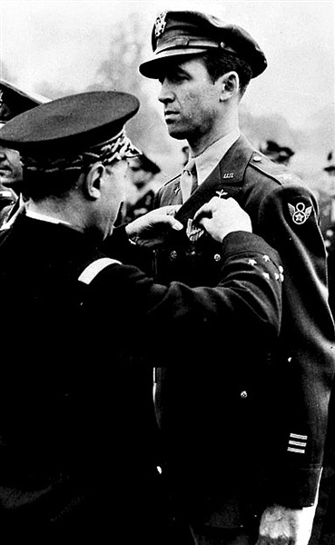 但报国心切的斯图尔特却不甘心做花瓶。他多次强烈要求去前线执行作战任务,最终,上级经不住他的恳求。1943年11月,斯图尔特以上尉军衔随第445轰炸机大队第703中队进驻英国,该部队被编进了著名的第8航空队。斯图尔特到英国后很快就开始驾驶B-17空中堡垒式轰炸机出击作战。一开始,他手下的机组人员并不信任这个前明星,他看起来有点沉默,紧张时还会口齿不清,整个机组另外9个人的命都攥在他手上呢,这可不是开玩笑追星的时候。但很快斯图尔特就以实际表现赢得了战友的信任。他多次驾机轰炸德国,执行过的最值得骄傲的作战任务之一,是曾经引导过超过上千架轰炸机的大型编队轰炸柏林。斯图尔特也多次化险为夷,有一次在轰炸斯图加特时,一枚德军88毫米高炮炮弹挨着他的座架爆炸,将他飞机座椅下的地方打出一个洞。但斯图尔特竟然幸运的毫发未伤。战争期间,第8航空队因为损失特别惨重,出现大批空缺,因此幸免于难的人升官非常快。参战4个月后,斯图尔特已经升任中校中队长。到1944年夏天,他已经是上校了。