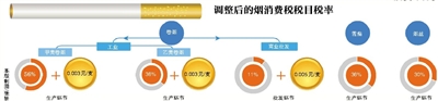 “以零售指导价为10元一包的烟来说,烟草公司卖给零售商的价格大概是8.8元一包,烟草税上涨后,烟草公司的价格会在9.3-9.4元一包左右,零售商可能也会随之上调0.6元,大概在10.6元左右。”上述销售人员说,价格上涨会影响部分烟民,消费量肯定会减少。