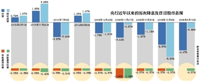 新京报记者统计发现,自2002年降息之后,央行自2005年以来的十年间共计有包括本次降息在内的10次降息。在已经披露的9次降息后首个交易日,只有3次上涨,上涨概率为1/3。