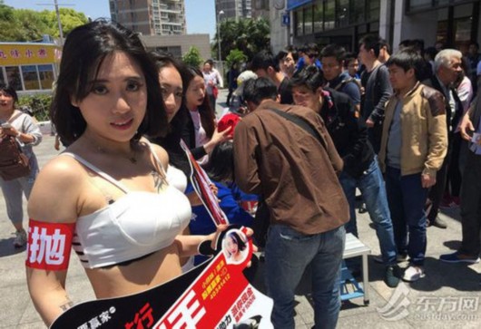 原标题: 沪张江现美女嫩模举股市警句秀长腿胸器(组图)