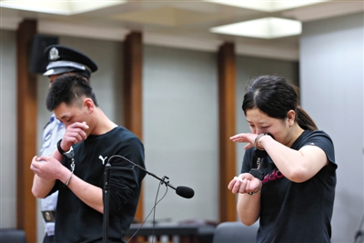昨日,被告人贾利园和丈夫王远志在法庭上抹泪。去年10月,25岁的贾利园睡着后被2岁的儿子吵醒,对儿子采用摔、掐等手段,又用塑料袋套在孩子脑袋上,并用棉被压盖,导致孩子窒息死亡。其后,贾利园与丈夫一同开车到河北怀来,将尸体掩埋。昨日,贾利园涉故意杀人罪,王远志涉毁灭证据罪和包庇罪在市二中院受审,贾利园对检方指控的杀害儿子行为表示认罪,她一遍又一遍重复,自己不是故意的,所做的一切只是想让儿子停止哭闹。新京报记者 王贵彬 摄