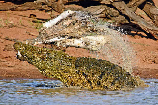 据莱斯尔回忆,这只成年鳄鱼身长4米。待斑马慢慢靠近后,它猛地蹿出水面,张开血盆大口,紧紧咬住猎物,并向反方向甩动,撕扯下大块鲜肉。