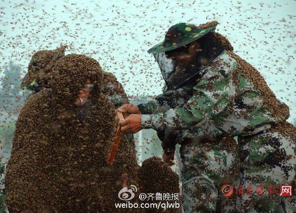据齐鲁晚报官方微博5月25日报道,25日凌晨,“泰山蜂王”高丙国在接受上百万只蜜蜂蛰身,再次挑战世界吉尼斯纪录并成功。这套“蜂衣”重109.05公斤,每公斤有万只蜜蜂,打破85.5公斤的世界记录。高丙国全身多处被蛰伤,挑战成功后体温高达六七十度。(齐鲁晚报 刘红杰 图片来源:齐鲁晚报官方微博)