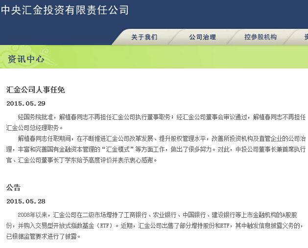 5月29日,中投公司网站发布公告称,董事会审议通过,聘任郭向军为中投公司副总经理;解植春不再担任中投公司副总经理职务。