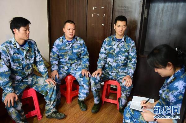 6月4日,官东的战友们在介绍官东当时水下救人的情况。 24岁的官东这几天已成为家喻户晓的名人。在长江客船翻沉事件的救援过程中,他多次下潜,凭借高超的潜水技术,一连救出两名幸存者;危急时刻,他让出自己的潜水器具,险被急流冲走。其英雄义举,获得了网民的一致点赞。新华社记者郝同前 摄